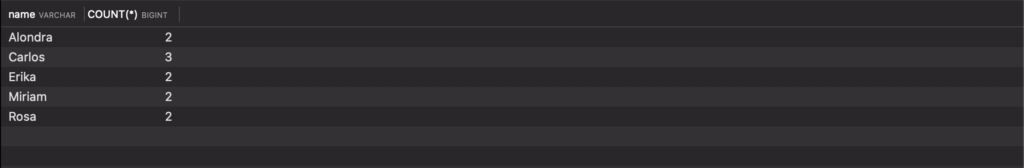 En esta consulta estamos solicitando de la tabla “clients” los registros donde el nombre se repita más de una vez.